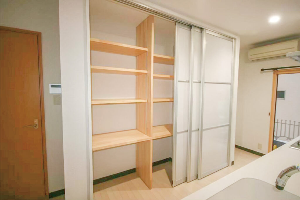 キッチンの改修を伴い、棚と設備の配置変更と扉付きの造作収納を設置いたしました!